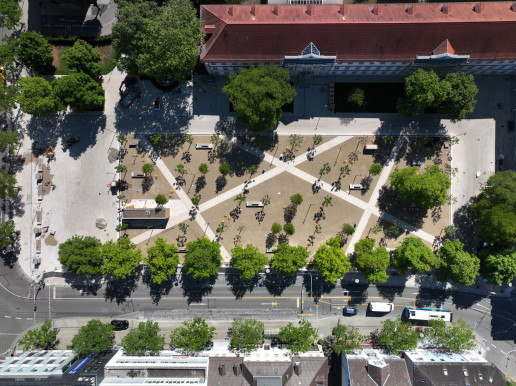 Die Umgestaltung des Arsenalplatzes in Ludwigsburg zeigt exemplarisch, wie eine ehemals monofunktiona-le Verkehrs- und Parkfläche in einen multifunktionalen Stadtraum transformiert werden kann. Durch die Schaffung eines Stadtparks mit einem Hain aus 60 Bäumen, Wasserspiel, flexiblen Aufenthalts- und Bewe-gungsflächen sowie gastronomischen Angeboten entstand ein Ort, der gleichermaßen Kühlung, Erholung, Begegnung und Veranstaltungen ermöglicht. Der Splitt-Belag kann Regenwasser aufnehmen, wodurch Ver-dunstungskühle entsteht. Außerdem wird Regenwasser von den Dachflächen des Arsenalgebäudes in einer Zisterne gesammelt, um in Zeiten von Hitze und Trockenheit für die Bewässerung der Bäume zur Verfügung zu stehen. Damit wird der Platz nicht nur ökologisch und klimatisch aufgewertet, sondern er erhält auch eine zentrale soziale Funktion im städtischen Gefüge. Das Projekt ist Teil des Sanierungsgebiets ZIEL (Zent-rale Innenstadt-Entwicklung Ludwigsburg). Es wird im Rahmen der Städtebauförderung mit insgesamt 1,2 Millionen Euro von Bund und Land, mit 3,6 Millionen Euro von der Stadt sowie mit 340.000 Euro vom Ver-band Region Stuttgart unterstützt.