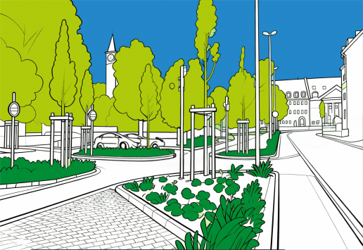 Multifunktionalität: Klimaanpassung (Regenwasserspeicherung + Hitzeschutz) + Stellplätze