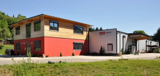 Einen Teil des räumlichen Erweiterungsbedarfs löste die pro-sort GmbH 2013 durch die Aufstockung des eingeschossigen Bürotrakts um ein weiteres Stockwerk. Auf diese Weise wurde der Gebäudegrundriss nur durch die Erweiterung der Produktionshalle vergrößert, wodurch die Bodenversiegelung auf das notwendige Minimum begrenzt werden konnte. Das Gebäude wurde bewusst in Holzbauweise umgesetzt, was nicht nur den persönlichen Vorlieben der Unternehmensführung entspricht, sondern auch ein behagliches Arbeitsklima schafft. Dank sorgfältiger Vorplanung waren die Aufstockungskosten gering, und es wurden keine Fördermittel benötigt. Das Dach der Produktionshalle wurde zusätzlich mit einer Photovoltaikanlage ausgestattet, um erneuerbare Energie zu nutzen. Seitens der Unternehmensführung wird von einer positiven Außenwirkung der Architektur berichtet, die sich unter anderem in der erhöhten Aufmerksamkeit von Passanten äußert, etwa durch das Fotografieren des Objekts.